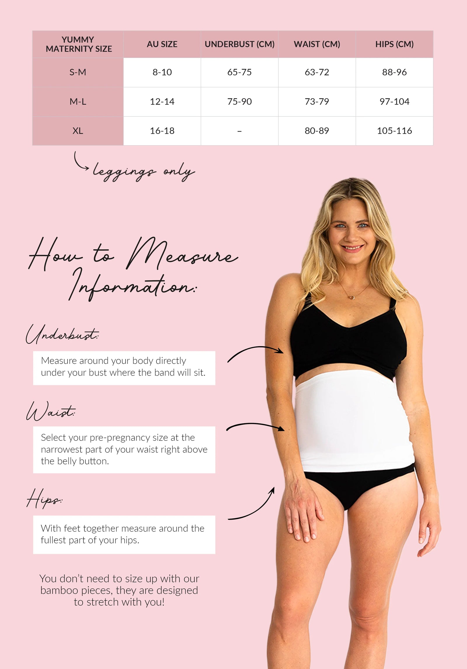 All our super stretchy garments are designed to accommodate bumps, boobs and bums so you only need to buy one size to stretch with you all the way. And back. Even though your body is changing, we recommend to select your pre-pregnancy size for ultimate comfort. The bamboo will do all the stretching for you. If you are unsure or a borderline size, it’s always best to size down if you generally prefer a closer, more supportive fit and size up if you prefer something more roomy.